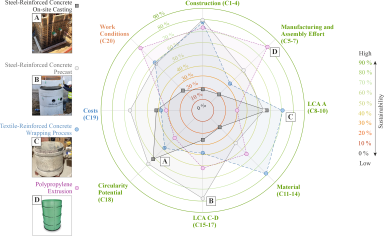Concrete construction faces increasing sustainability challenges. This study introduces a multi-criteria decision-making (MCDM) model that integrates 20 ecological, economic, and social criteria. The approach is applied to compare a wrapped textile-reinforced concrete (TRC) pump sump with cast-in-place, precast, and plastic alternatives. Results highlight that wrapped TRC achieves the strongest ecological performance, while further economic optimization is required. From a social perspective, the model shows that high labour demands and safety concerns reduce the performance of cast-in-place solutions. The framework offers a structured and transferable sustainability assessment.