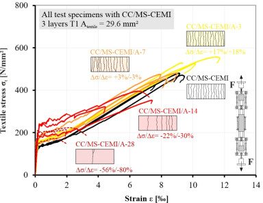Textile-reinforced concrete typically uses coated glass or carbon fibers, but uncoated textiles offer better recyclability and formability. A key challenge is the strength loss of uncoated alkali-resistant (AR) glass fibers due to corrosion in cementitious matrices. This study investigates how optimized concrete mixtures improve aging resistance. By incorporating silica fume, calcined clay, and CEM III blast furnace cement, strength losses of up to 50% – typically observed with CEM I – can be significantly reduced. These findings contribute to more durable and sustainable textile-reinforced concrete solutions.