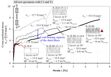 In the research project WiFaPu (Wrapping process for highly fiber-reinforced concrete using the example of a pump sump), a new production process for components made of short-fiber-reinforced textile-reinforced concrete was developed. The study investigates the load-bearing behavior via tensile and bending tests of the short-fiber-reinforced textile-reinforced concrete with uncoated AR-glass textile reinforcement. The concrete insertion method, the fiber content and length, and the weave direction of the textile reinforcement significantly influence the load-bearing behavior and crack spacing. Spraying and laminating exhibit lower strength and poor warp crack patterns due to roving lacing. Casting under slight tension leads to higher strengths.