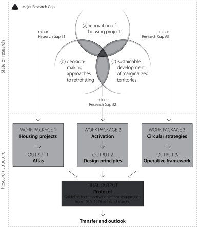 The state of research identifies three themes in the debate about 1950s–1970s housing stock in marginalized areas: (a) renovation of housing projects,1 (b) decision-making approaches to retrofitting,2 and (c) sustainable development of marginalized territories.3 In the intersection of the three themes, three minor research gaps (mRGs) highlight the need to investigate the following. Themes (a) and (b) → mRG#1: the qualities of buildings and the decisions to improve them; Themes (b) and (c) → mRG#2: the development of marginalized towns in deciding for retrofitting interventions; and Themes (a) and (c) → mRG#3: renovation through the inclusion of local stakeholders and resources to boost the circular economy. The major research gap (MRG) emerges from the mRGs as the need to expand retrofitting beyond technical aspects by considering the qualities and inner layouts of buildings, urban development goals, and local resources and stakeholders.