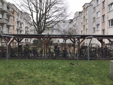 This research project focuses on bicycle parking near the home: residential bicycle parking. More specifically, the spatial focus of this research is on areas of Hamburg with mid-rise apartment buildings, one of the most common housing types in Hamburg. Red-brick or plaster-covered apartment buildings in the inner city are usually four to six stories, are well served by basic amenities – grocery stores, shops, restaurants – and are usually a reasonable cycling distance from workplaces. Most of these buildings were constructed between the 1890s and 1960s, designed during past mobility regimes when parking demands for bicycles were not considered. Today, many residents struggle to find a place to park their bikes that is safe from vandalism and theft, protected from the elements, and easy to access. There are, however, cases in which existing space has already been adapted. Bicycle sheds, bicycle racks, and retrofitted bicycle storage rooms in buildings can be found in a variety of forms across Hamburg, on both public and private property.
