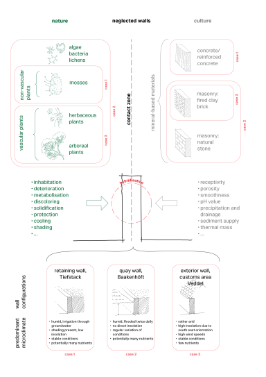 Three neglected wall surfaces within Hamburg are documented thoroughly, adopting a multimodal, transdisciplinary approach that combines site-specific observation, cartographic documentation, and theoretical analysis. This documentation will inform three careful, site-specific interventions that experimentally examine how architectural practice might move beyond anthropocentric paradigms and instead cultivate collaboratively shaped environments in response to interwoven ecological crises. Drawing on current debates in architectural theory, reflection on the study’s empirical findings and interventions will inform the development of materially grounded design strategies that are attentive to spontaneous inhabitation and help to counteract situated ecological crises.